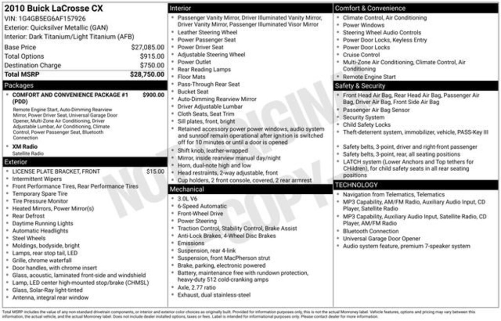 Clean CARFAX. 2010 Buick LaCrosse CX FWD 6-Speed Automatic Electronic with Overdrive 3.0L V6 SIDI DOHC VVT 3.0L V6 SIDI DOHC VVT.